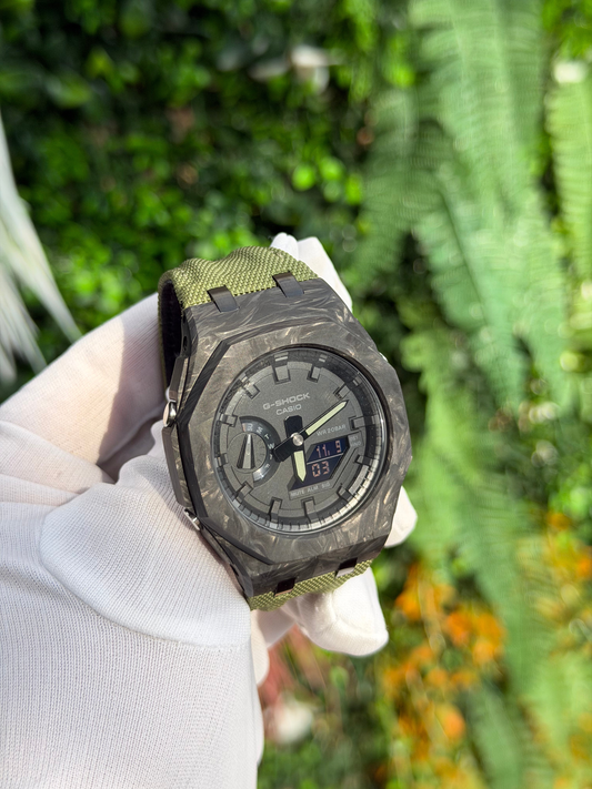 Montre CasiOak Custom – Full Green Bluetooth Carbon Fiber - Nylon Canvas Velcro Strap - Mod G-Shock GAB2100