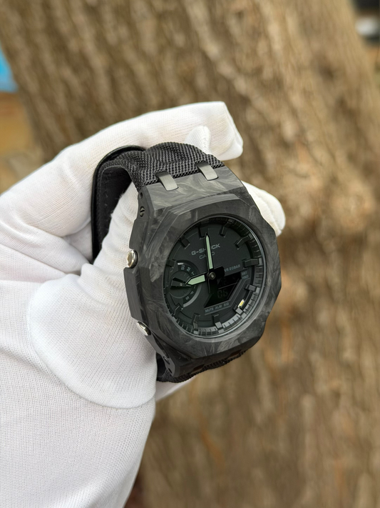 Montre CasiOak Custom – Full Black Carbon Fiber - Nylon Canvas Velcro Strap - Mod G-Shock GA2100