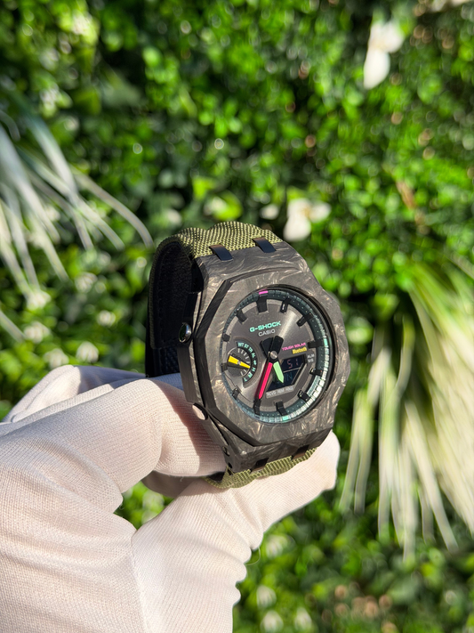 Montre CasiOak Custom – Full Green Bluetooth Carbon Fiber - Nylon Canvas Velcro Strap - Mod G-Shock GAB2100